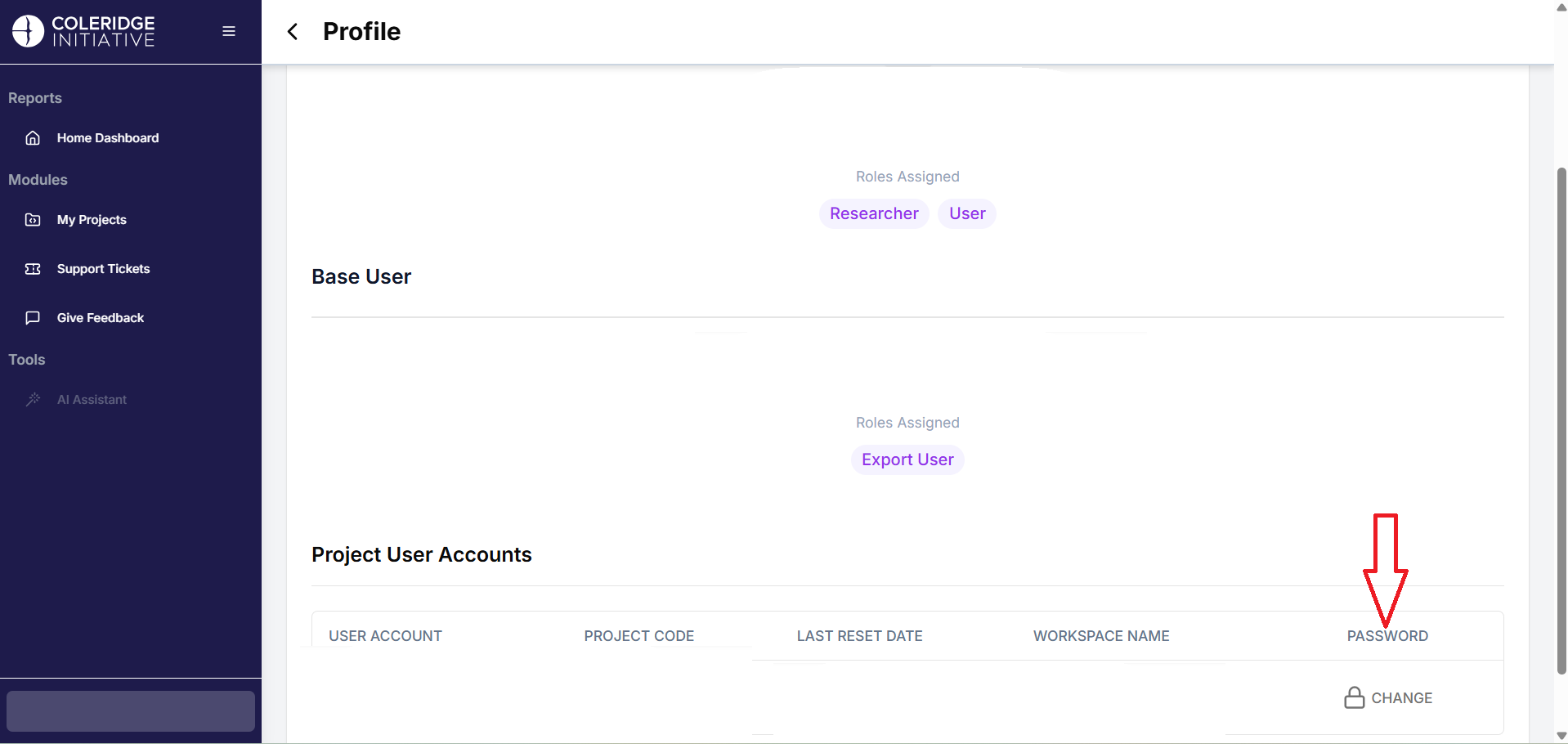 - This will direct you to your profile page. You can see information like the Base User and Project User Accounts. Under the Project User Accounts, click on the Change button under “Password.” Refer to the image underneath.